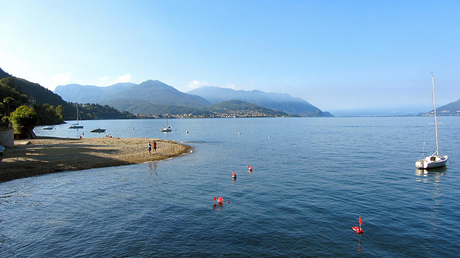 Packen schon mal zusammen, was geht und sind um halb zehn beim tollen, umfangreichen Frühstücksbuffet, das erstmals in diesem Urlaub diesen Ausdruck auch wirklich verdient. Zur Verdauung spazieren wir dann an dem zum Hotel gehörenden Strandabschnitt entlang und genießen den Blick auf den Lago Maggiore in der klaren Morgenluft. Finden dabei ein angenehm temperiertes Jacuzzibecken direkt am Seeufer - wenn es uns früher aufgefallen wäre, hätten wir vielleicht noch einen belebenden Abstecher hinein gewagt.