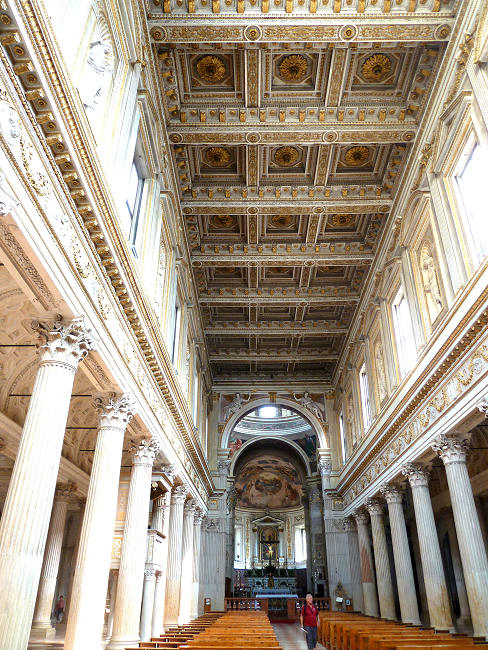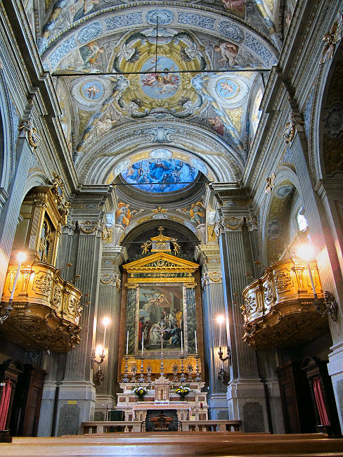 Spazieren durch den Palazzo Pelote - dessen Innenhof mit Tribünen und einer Bühne komplett ausgefüllt ist - ins Zentrum. Die Touristen-Info ist übersiedelt und montags erst nachmittags offen, also spazieren wir durch die Fußgängerzone zur Kirche Santa Maria della Steccata. Diese Renaissance-Kirche repräsentiert den Sitz des Konstantinianischen Georgsordens und ist die letzte Ruhestätte der Herzöge von Parma. Versehentlich betreten wir die Kirche jedoch durch das angrenzende Ordens-Museum und kommen in den "Genuss" einer langatmigen einstündigen Führung mit Blick in die barocke Sakristei und die Herzogsgruft.