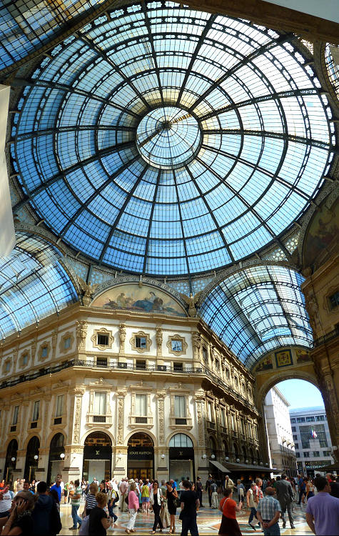 Danach bummeln wir durch die Galerie Vittorio Emanuele II. auf der anderen Seite des Doms. Die vielen Geschäfte, Boutiquen und Lokale unter der Glasüberdachung aus der vorletzten Jahrhundertwende sind uns für Einkäufe aber schlichtweg zu teuer.