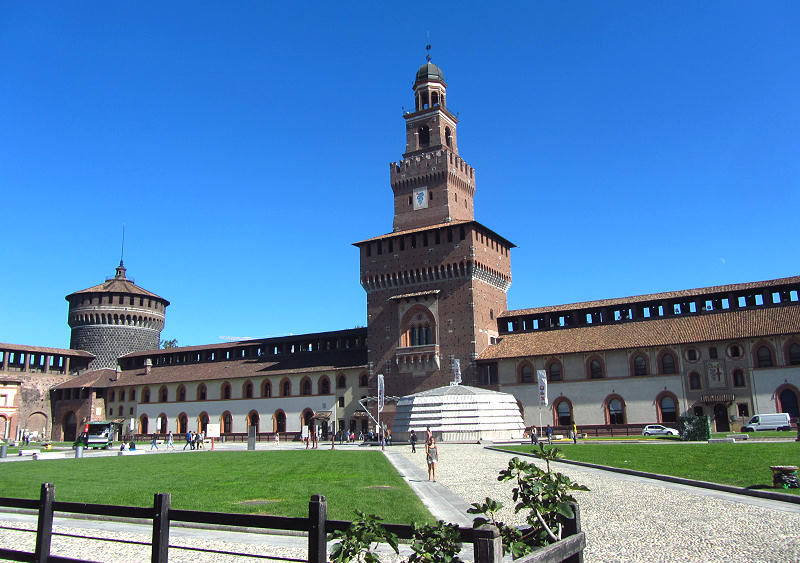 Nimmermüde machen wir uns gegen vier dann noch einmal auf den Weg zum Castello. Haben dort gestern nicht alle Museen besuchen können und das holen wir heute nach. Um 17:30 wird geschlossen, aber bis dahin haben wir die Gemäldesammlung unter anderem mit Werken von Leonardo da Vinci, die ägyptische Sammlung, das Museum für angewandte Kunst, die Musikinstrumentensammlung und noch ein paar andere gesehen.