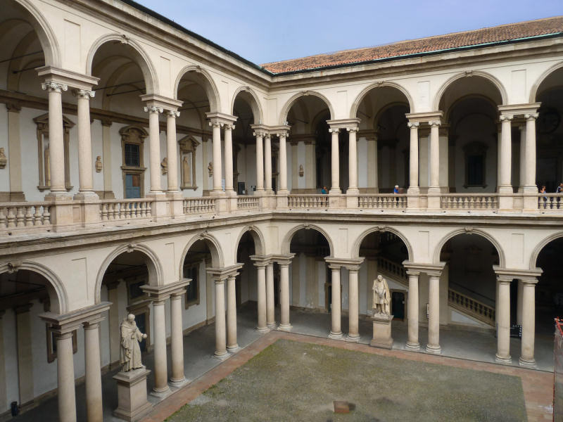 Der Ausgang ist ganz unscheinbar in einer Seitenstraße und wir müssen uns erst orientieren. Eine Metro-Fahrt lohnt nicht zum nächsten Ziel, also stiefeln wir los zum barocken Palazzo Brera. Unterwegs halten wir Mittagsrast in einem Irish Pub, und so gestärkt kämpfen wir uns anschließend durch die unzähligen Säle der Pinacoteca Brera. Die Bandbreite der Exponate reicht von mittelalterlichen Fresken bis zu Gemälden italienischer Künstler der Neuzeit. Im Palast, der gerade höchst umfassend renoviert wird (kaum ein Zugang der nicht durch Gerüste oder Absperrungen verstellt ist), liegt noch das kleine astronomische Museum mit entzückend altmodischen Utensilien für Sternenkundler. Alles ist nett angeordnet, aber so wahnsinnig viele Ausstellungsstücke sind es dann doch nicht, sodass wir recht schnell durch sind und beschließen noch ein paar Kirchen anzuschauen.