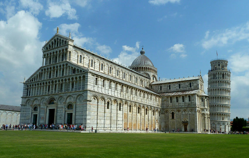 Nach einem sehr einfachen Frühstück nehmen wir gegen halb zehn die circa 20 km nach Pisa unter die Räder. Ganz in der Nähe des Doms finden wir einen sehr günstigen Parkplatz (0,60 € pro Stunde, Vorausbezahlung am Automaten) und stellen das Auto ab. Spazieren das kurze Stück zur Piazza dei Miracoli, dem Platz der Wunder. Hier im Schwemmland des Arno errichteten die Bürger der Stadtrepublik Pisa ab dem 11. Jahrhundert aus weißem Carrara-Marmor das unvergleichliche Ensemble aus Baptisterium, Camposanto, dem Dom Santa Maria Assunta und dem freistehenden Campanile. Dieser speziellen Lage verdankt die Stadt ihre Berühmtheit, denn im schlechten Boden neigte sich der Glockenturm immer mehr und wurde zum Wahrzeichen Pisas.