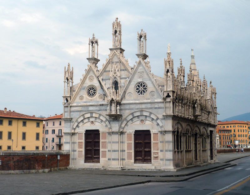Beim Verlassen des Komplexes gegen 13:00 Uhr ist es schon wieder düster. Überlegen was wir jetzt noch machen könnten und beschließen, in die Altstadt zu gehen. Spazieren zur asymmetrischen Piazza dei Cavallieri mit dem namensgebenden bemalten Palazzo und der Universität. Dann weiter zum Arno und unter dem Vordach einer Bar schreiben wir bei einem Kaffee und leichtem Regenschauer die unterwegs erstandenen Ansichtskarten.