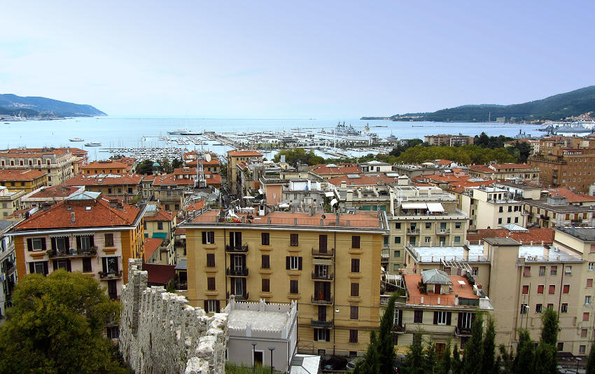 Die Sachen sind schnell zusammengepackt und nach dem Frühstück holen wir das Auto aus der Garage. Dank Navi finden wir problemlos durch den Vormittagsstau auf dem Autobahnring um Mailand und kurven Richtung Genua. Dann geht es der Küstenstraße entlang und in Cavi di Lavagna frischt Werner ein paar Kindheitserinnerungen auf. In einer kleinen Strandbar auf Stelzen halten wir Rast, dann folgen wir der Küste bis La Spezia.