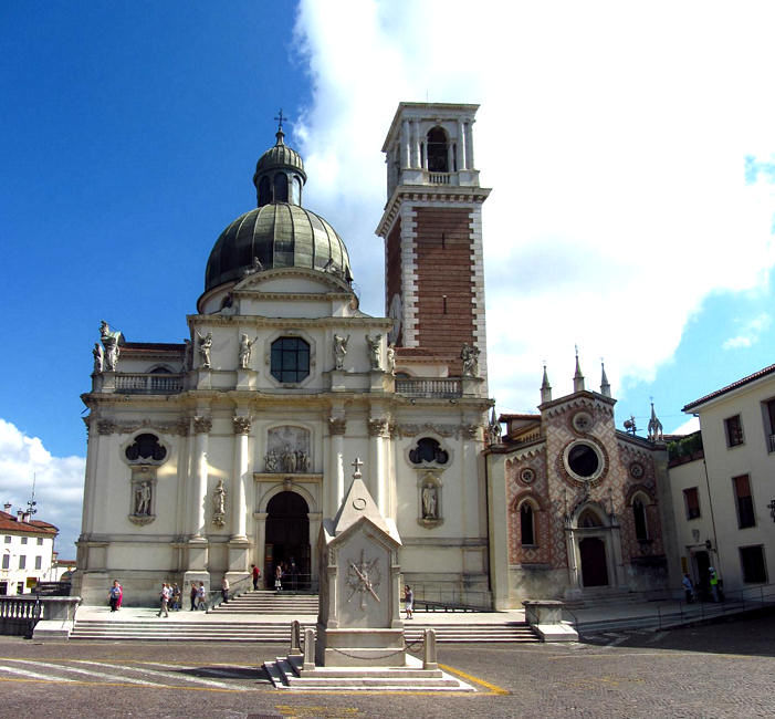 Von den beiden Villen aus hat man einen schönen Blick auf einen imposanten Kirchenkomplex ein paar Hügel weiter. Den steuern wir jetzt an. Kurz vor zwölf erreichen wir den Marien-Wallfahrtsort Monte Berico mit zwei Kirchen (ein Zentralbau mit Kuppel und ein Langbau mit hohem Turm) an einem kleinen Kreuzgang und einem riesigen Parkplatz. Von hier bietet sich ein schöner Blick über die Stadt Vicenza.