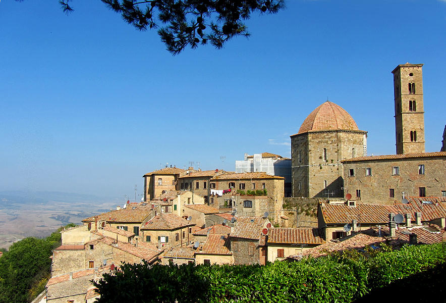 Frühstücken wieder im Freien und starten die heutige Tagestour um halb zehn. Fahren durch die hügelige Landschaft der Toskana nach Volterra und finden kurz vor zehn im Parkhaus 1 direkt unter der Altstadt noch reichlich Parkplätze vor.