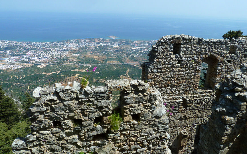Bekommen eine Stunde Zeit, um die mit dem steilen Felsen regelrecht verwachsene Festungsanlage zu erkunden. Eintritt müssen wir keinen zahlen, es ist Museumswoche (anlässlich eines Feiertags). Kommen ganz schön ins Schwitzen auf unserem Weg durch die Reste der Burg, vorbei an der alten Burgkapelle und den Prinz-Jean-Turm hinauf zum obersten Punkt. Viel ist nicht mehr übrig, das aber mit Ausblick! Von hier kann man bis Girne und über das Meer oder das gebirgige Hinterland schauen.