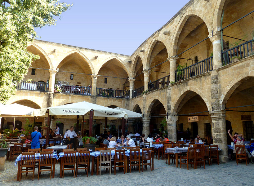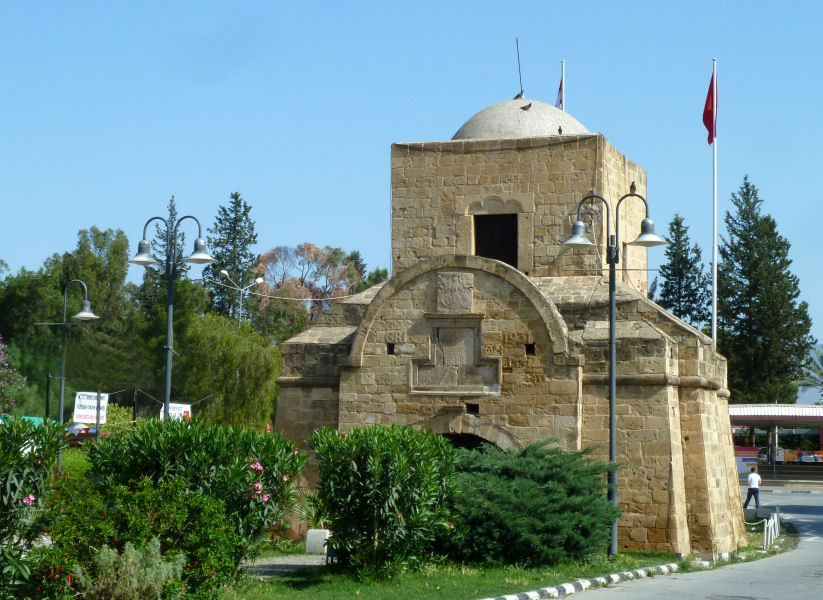 Hier erkunden wir nun den türkischen Teil der Altstadt. Viel ist nicht (mehr) zu sehen und auch das Volkskunde-Museum im Derwish-Pasha-Haus ist derzeit eine Baustelle. Spazieren einfach so durch die Gassen, stöbern durch den kleinen gedeckten Basar und schauen die Selimiye-Moschee in der einstigen gotische Basilika Agia Sophia an. Die Gebetsnische ist recht schief (nach Mekka ausgerichtet) in einem Seitenschiff untergebracht und auch die Gebetsteppiche sind quer in der weiß bemalten Säulenhalle verlegt. Trotzdem ist sie recht hübsch.