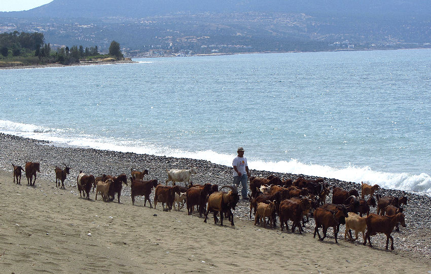 Der Strand selbst ist steinig, aber nur wenige Meter im Wasser wird der Boden sandig und man kann gut stehen. Einziges "Unterhaltungsprogramm" ist jeweils am Nachmittag ein Ziegenhirte, der seine Tiere am Strand entlang führt.