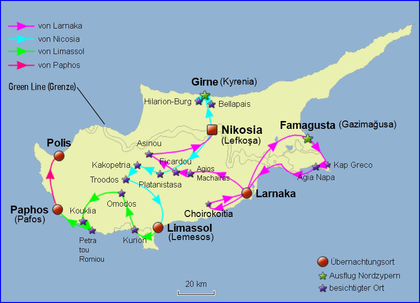 1. Tag: München - Larnaka 2. Tag: Larnaka 3. Tag: Kiti - Choirokoitia - Lefkara - Pyrga - Larnaka (128 km) 4. Tag: Salamis - Famagusta - Kap Greco - Larnaka (132 km) 5. Tag: Agios Machaira - Ficardou - Asinou - Nikosia (181 km) 6. Tag: Girne - St. Hilarion - Bellapais - Lefkoşa (Nord-Nikosia) 7. Tag: Nikosia 8. Tag: Troodos - Kakopetria - Limassol (188 km) 9. Tag: Kurion - Limassol (54 km) 10. Tag: Omodos - Kouklia - Petra tou Tomiou - Paphos (140 km) 11. Tag: Paphos - Polis (77 km) 12. bis 14. Tag: Polis (16 km) 15. Tag: Polis - Larnaka Flughafen (172 km) - München und Heimfahrt |