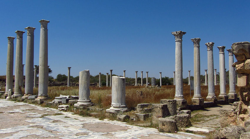 Die Wurzeln der größten antiken Stadt Zyperns reichen ins elfte vorchristliche Jahrhundert zurück und erst 1500 Jahre später wird sie endgültig verlassen. Am meisten zu sehen ist in der Nähe des Eingangs, da sind Säulen wieder aufgerichtet und Mosaike freigelegt. Kopflose Statuen zieren Simse und im Amphitheater sind die Sitzstufen ausgebessert. Aber auch bei einem Spaziergang durch die Landschaft kann man immer wieder etwas entdecken. Die Anlage ist auch nicht sonderlich überlaufen, so kann man sich durchaus als Entdecker fühlen.
