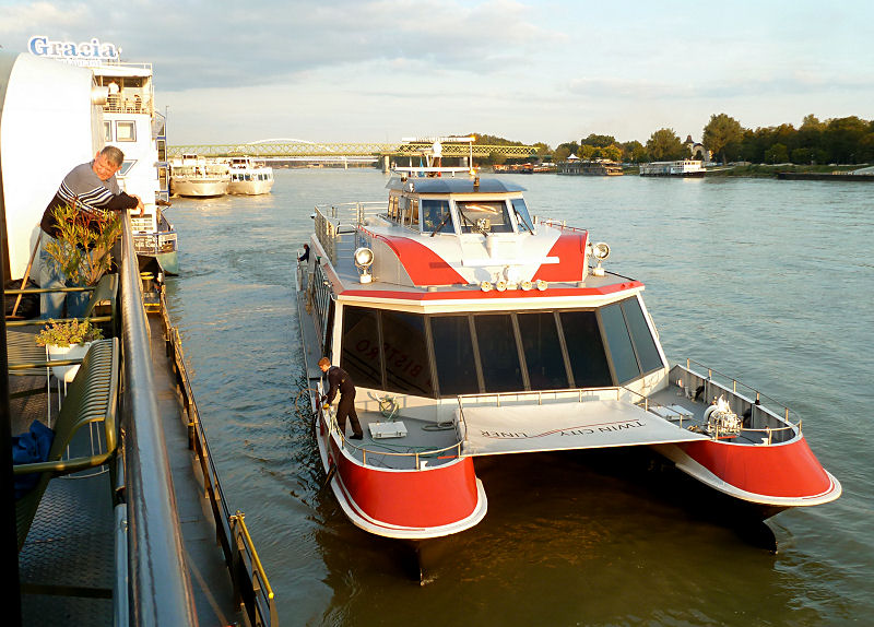 Mittlerweile ist die Sonne herausgekommen und wir steigen noch einmal in die Altstadt hinunter, vielleicht ergeben sich nun hübschere Fotos. Der Abstecher ins Fotografiemuseum dauert nur kurz und bald schon stehen wir am Ufer der Donau. Setzen uns beim Anleger des Twin-City-Liners (der Katamaran-Verbindung zwischen Wien und Bratislava über die Donau) in die schwimmende Bar und genießen die plötzlich strahlende Sonne bei einem böhmischen Bier. Geben uns dem Müßiggang hin und schauen irgendwann der Sonne beim kitschigen Untergang zu - Urlaubsfeeling pur!