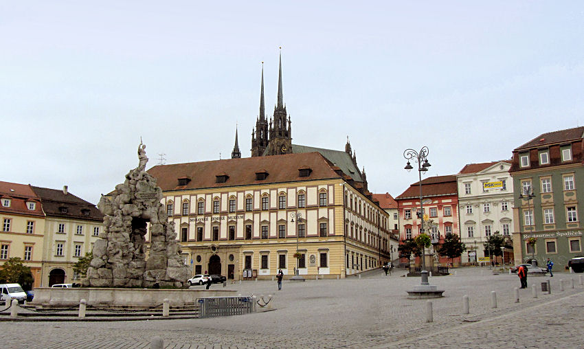 Starten nach dem Frühstück bei wieder trübem Wetter mit einem Fußmarsch ins Zentrum, vorbei an diversen Kirchen, die wegen stattfindender Messen nicht besichtigt werden können. Beim von einem markanten Turm überragten alten Rathaus bestaunen wir das spätgotische Portal mit dem schiefen Türmchen und im Durchgang den "Brünner Drachen". Außerdem ist hier die Touristeninfo untergebracht, wo wir eine Tageskarte für die Öffis (erfreulicherweise am Wochenende 2 zum Preis von einer) erstehen. Versuchen dann unser Glück beim Dom, wo aber auch gerade wieder Messe gefeiert wird.