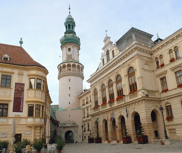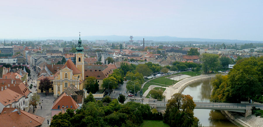 Diesem folgend kommen wir zuerst zum (hässlich) modernen Nationaltheater und dann zum zentralen Szechenyi-Platz. Dieser beeindruckt neben den hübschen Barockfassaden der umstehenden Häuser mit der Mariensäule und der Benediktinerkirche mit den zwei Türmen. Das barocke Innere ist reich geschmückt, die goldene Kanzel sticht besonders hervor. Der Spaziergang führt uns weiter durch die Altstadt mit modernen Skulpturen zur Karmeliterkirche. Auch diese ist barock mit einem ovalen Kirchenschiff. Nur wenige Minuten Fußmarsch entfernt steht der Dom, allerdings wegen Renovierung geschlossen, daher gehen wir weiter zum Bischofspalast, aber auch der ist wegen Renovierung geschlossen. Immerhin kann man einen Turm besteigen, was wir dann auch machen. Nach einem Abstecher zu einem Museum mit moderner Kunst und dem "Siphon-Brunnen" holen wir das Auto aus der Parkgarage und fahren eine knappe halbe Stunde südwärts.