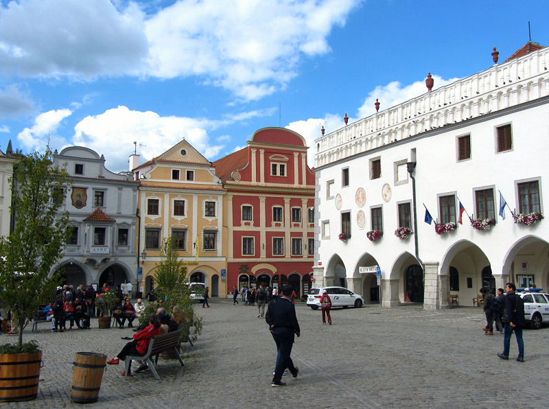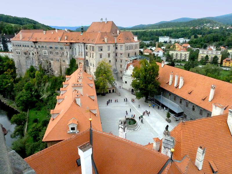 So fahren wir knapp 20 km Umweg zu einer Brücke und kommen am Nordufer wieder zurück. Dann geht es zügig durch sanft hügelige Landschaft bis wir zu Mittag Český Krumlov, zu deutsch Krumau, erreichen. Stellen das Auto nahe der Innenstadt auf einem Parkplatz beim Schloss ab und gehen gleich hinauf zum Eingang. Die nächste Führung ginge erst in 2 Stunden los, aber so lange wollen wir nicht tatenlos warten.