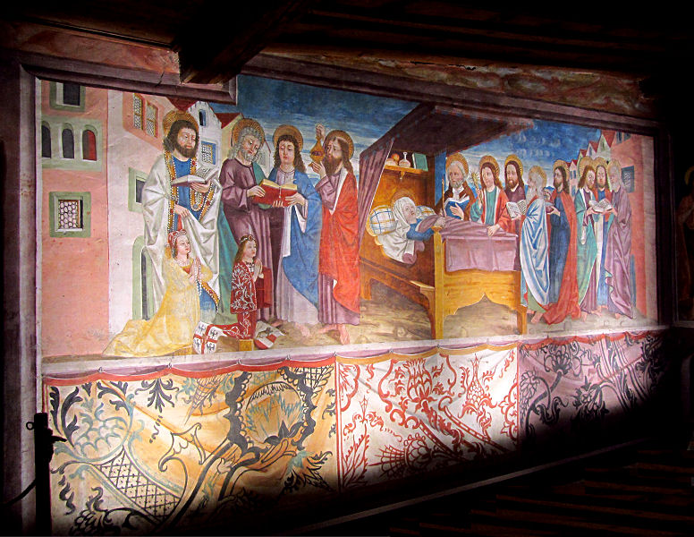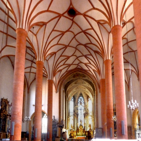 Das spätgotische Innere wird geprägt von orangerot bemalten Säulen, sehenswert sind auch ein Christophorus-Fresko und die spätgotische Kanzel. Im Anschluss besteigen wir auch den Turm der Jakobskirche, werfen einen Blick in die Glockenstube und dann über die Stadt bis zur Burgruine Landskron.