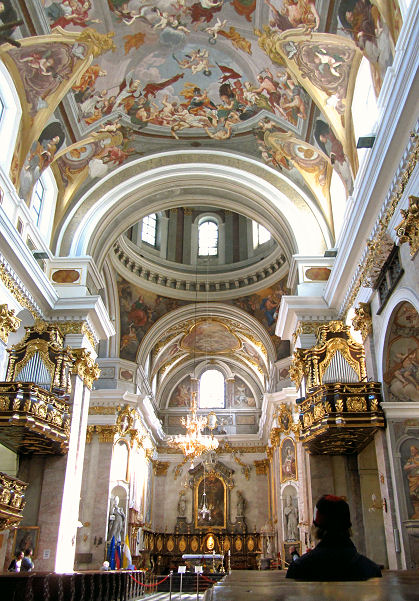 Die Franziskanerkirche und auch die außerhalb der eigentlichen Altstadt gelegene Dreifaltigkeitskirche sind wieder geschlossen, aber Fenster ermöglichen einen Blick ins Innere. Das Michaelertor mit Turm ist das letzte Überbleibsel der einstigen Stadtbefestigung. Nach einem Abstecher ins Postamt um Briefmarken zu kaufen, spazieren wir wieder in die Altstadt und steuern nun den Martinsdom am Fuß des Burghügels an.