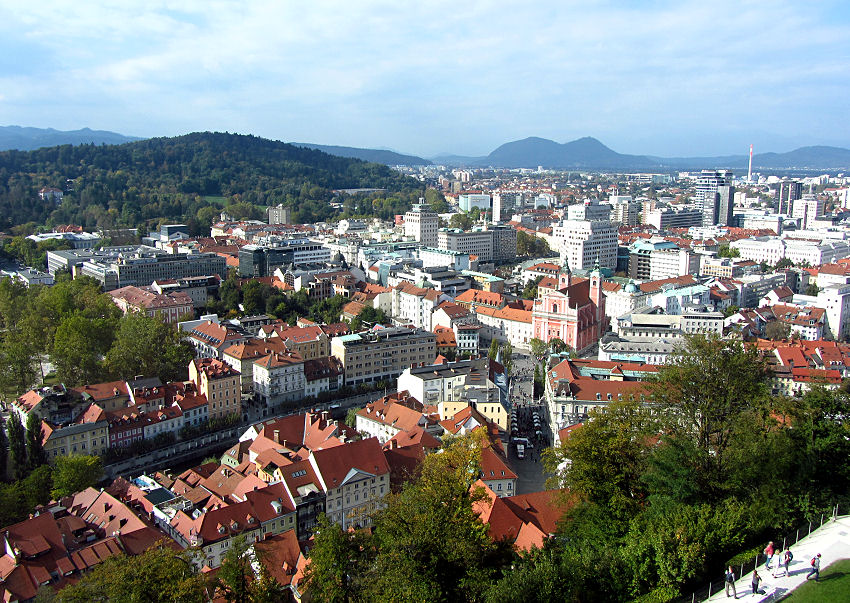 Erreichen nach eineinhalb Stunden die slowenische Hauptstadt Ljubljana, die unter einer sich langsam auflösenden Hochnebeldecke liegt. Auch hier finden wir dank Navi ein Parkhaus in der Nähe des historischen Zentrums und haben von dort nicht weit zur Touristeninformation. Diese liegt günstig südlich des Flusses Ljubljanica neben der dreiteiligen Brücke, einer der Hauptsehenswürdigkeiten der Stadt Laibach.