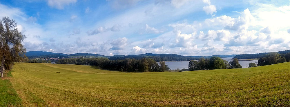Nach einem guten Frühstück machen wir uns auf, um nach Böhmen zu reisen. Unser Navi führt uns auf der Autobahn bis kurz vor Passau und von dort querfeldein, sogar noch einmal für ein paar Kilometer zurück nach Österreich. Gondeln durchs nördliche Mühlviertel und den Böhmerwald bis zu einem namenlosen Grenzübergang nach Tschechien. Kaum aus dem Wald heraußen sehen wir auf die Moldau, die hier zum Stausee Lipno aufgestaut wird. Nach ein paar Kilometern führt die Straße direkt ans Ufer zu einem Fähranleger. Die Fähre verbindet das Südufer mit Horni Plana auf der gegenüberliegenden Seite, sie hat aber gerade abgelegt.