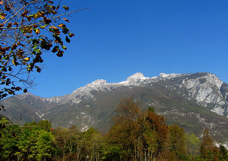 Heute geht es wieder nach Österreich zurück. Das Wetter ist schon in der Früh traumhaft und so beschließen wir, nicht die schnellste, sondern die schönste Strecke zu nehmen. Daher überqueren wir in der Stadt die Grenze nach Nova Gorica, der slowenischen Stadthälfte. Dann geht es dem Fluss Isonzo, der slowenisch Soča heißt, entlang nach Norden. Die Straße führt teils durch eine zerklüftete Landschaft, teils durch eine weite Talsenke, über enge, kurvige Bergstraßen und eröffnet immer wieder wunderschöne Ausblicke auf kleine Dörfer, herbstlich gefärbte Wälder, die Aulandschaften der Soča und die Gipfel der Julischen und Karnischen Alpen.