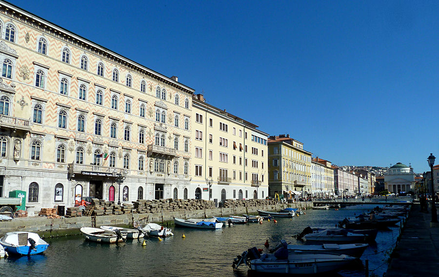 Heute beginnt hier im Golf von Triest mit der "Barcolina", einer Nachwuchsregatta, das Vorprogramm für die "Barcolana", der größten Segelregatta der Welt. Überall im Zentrum und am Hafen stehen Bühnen und Zelte mit Segelbedarf oder Verpflegung. Wir besorgen uns eine kleine Erfrischung, die wir in und mit der Sonne an der Mole genießen. Schließlich schlendern wir die Promenade entlang bis zum Canal Grande, an dem diverse Palazzi mit schönen Fassaden gerade von der Sonne angestrahlt werden. Spazieren dann weiter durch die Altstadt und kommen noch zu einigen römischen Resten, wie dem Teatro Romano und dem Richardsbogen. Schauen dann noch beim Aquarium vorbei, aber das ist eher eine traurige Angelegenheit und wir sind bald fertig. Gönnen uns zum Abschluss der Besichtigung am Hauptplatz im Caffè degli Specchi einen Mojito in der Sonne, flüchten nach dem Austrinken aber rasch, da bei der Bühne auf dem Platz der Soundcheck beginnt.