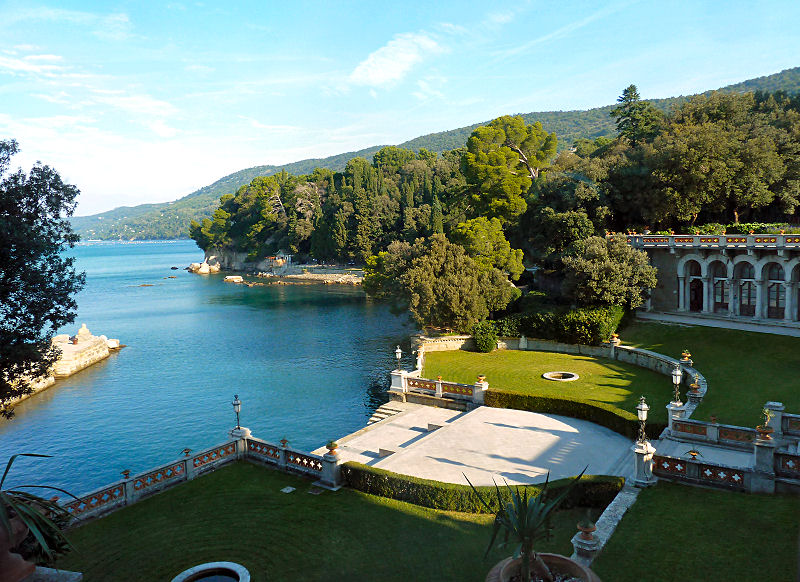 Das Innere ist der Zeit entsprechend ausgestattet, wobei die Einrichtung größtenteils noch original ist. Viel Holz, Marmor und Brokat, Nippes, Portraits und Intarsien prägen dieses Museum. Aus den Fenstern hat man einen schönen Blick auf das Meer - Miramare heißt ja auch Meerblick. Nach einer Stunde verlassen wir das zinnengekrönte Gebäude und genießen noch die angenehme Atmosphäre im weitläufigen Parkgelände bei einem Spaziergang zum Castelletto, dem 'kleinen' Gartenhaus.
