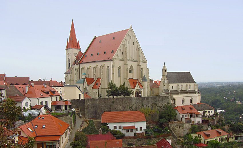 Weiter geht es dann zum aufgelassenen Minoritenkloster (nun ein Museum) und hinauf zur Burg auf einer Erhebung über dem Fluss Thaya. Dort steht mit der Rotunde St. Katharina eines der ältesten noch erhaltenen Gebäude der Stadt - innen angeblich reich mit romanischen Fresken geschmückt, bei unserem Besuch aber leider geschlossen. Von hier heroben hat man einen hübschen Blick auf das Zentrum und zur St. Nikolaus-Kirche, dem Dom von Znaim. Dorthin gehen wir als nächstes und das lohnt sich - zumindest heute. Das Innere ist derzeit mit üppigen Arrangements von Obst, Gemüse und Feldfrüchten zum Erntedank geschmückt.